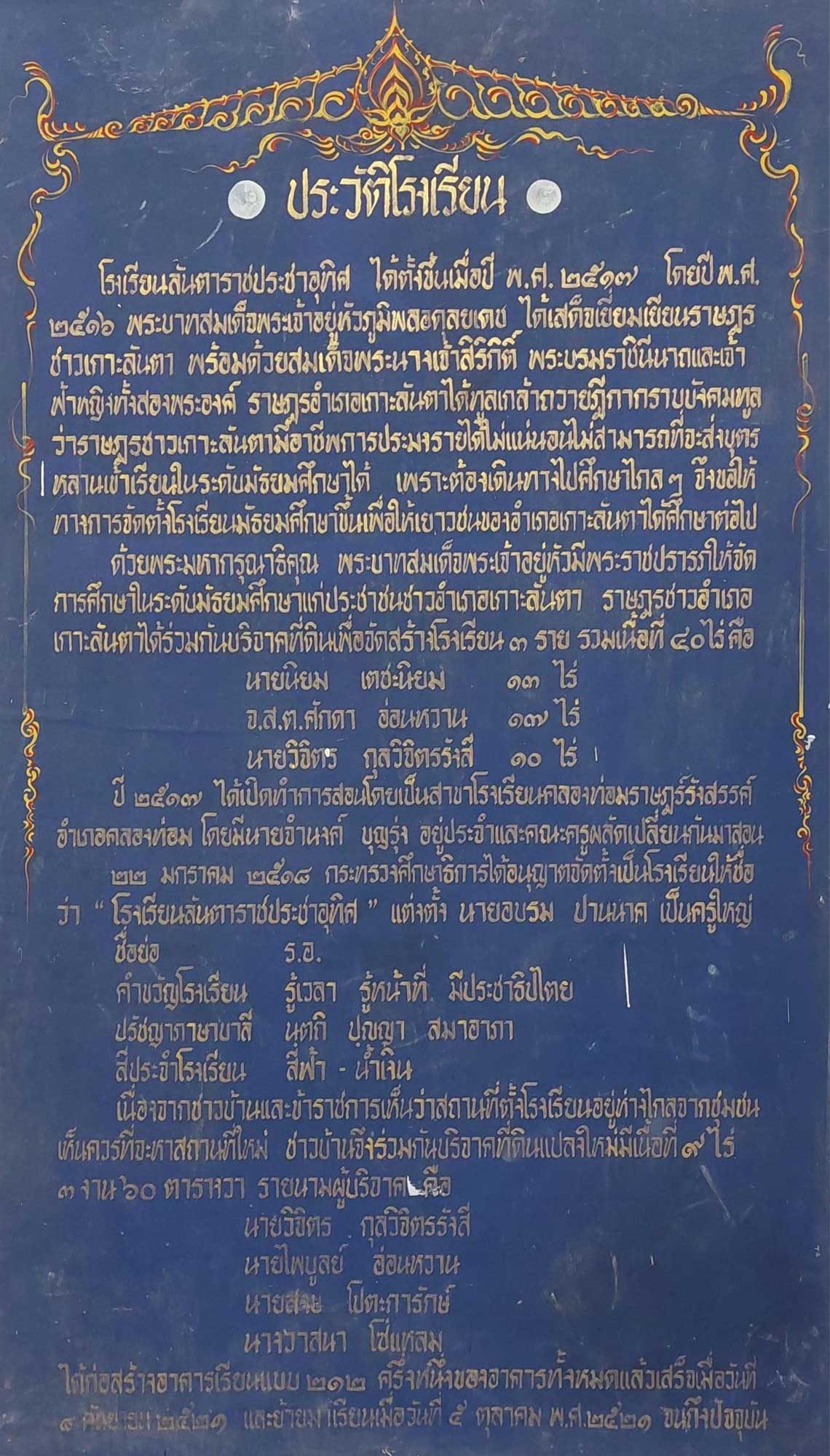 ประวัติความเป็นมาของโรงเรียนเมื่อ พ.ศ. 2516 พระบาทสมเด็จพระเจ้าอยู่หัวภูมิพลอดุลยเดช ได้เสด็จเยี่ยมราษฎรจังหวัดกระบี่ ราษฎรชาวอำเภอเกาะลันตาได้ถวายฎีกาและกราบบังคมทูลว่า ราษฎรชาวอำเภอเกาะลันตามีอาชีพไม่แน่นอน โดยอาศัยการประมงเป็นหลักในการประกอบอาชีพ มีรายได้ไม่เพียงพอที่จะส่งบุตรหลานไปศึกษาต่อใน สถานศึกษาต่างถิ่นได้ จึงขอให้ทางการสร้างโรงเรียนมัธยมศึกษาขึ้นในอำเภอ เกาะลันตา เพื่อให้บุตรหลานชาว อำเภอเกาะลันตามีโอกาสศึกษาเล่าเรียนในระดับมัธยมศึกษาต่อไปด้วยพระมหากรุณาธิคุณ พระบาทสมเด็จพระเจ้าอยู่หัวทรงมีพระราชดำรัสแก่หน่วยงานที่เกี่ยวข้องกับการจัดการศึกษาในระดับมัธยมศึกษาในอำเภอเกาะลันตา โดยมีราษฎรช่วยกันบริจาคที่ดินเพื่อจัดสร้างโรงเรียน จำนวน 3 ราย คือ 1. นายนิยม เตชะนิยม บริจาคที่ดิน จำนวน 13 ไร่ 2. จ.ส.ต. ศักดา อ่อนหวาน บริจาคที่ดิน จำนวน 17 ไร่ 1 งาน 3. นายวิจิตร กุลวิจิตรรังสี บริจาคที่ดิน จำนวน 10 ไร่ 2 งาน 90 ตารางวา รวมพื้นที่ทั้งหมด 40 ไร่ 3 งาน 90 ตารางวา ณ หมู่ที่ 1 ตำบลเกาะลันตาใหญ่ อำเภอเกาะลันตา จังหวัดกระบี่ ในปีการศึกษา 2517 เปิดทำการสอนเป็นปีแรก โดยใช้สถานที่ของโรงเรียนวัดเกาะลันตาเป็นที่จัดการ เรียนการสอนชั่วคราว และเป็นโรงเรียนสาขาของโรงเรียนคลองท่อมราษฎร์รังสรรค์ มีนักเรียนรุ่นแรก จำนวน 42 คน เป็นนักเรียนชาย 28 คน นักเรียนหญิง 14 คน โดยมี นายจำนงค์ บุญรุ่ง ข้าราชการครูโรงเรียนคลองท่อมราษฎร์รังสรรค์ เป็นหัวหน้าสาขา และข้าราชการครูโรงเรียนคลองท่อมราษฎร์ รังสรรค์ผลัดเปลี่ยนกันมาทำการสอน ในปีการศึกษาเดียวกัน กรมสามัญศึกษาได้แต่งตั้งนายอบรม ปานนาค ข้าราชการครูโรงเรียนคลองท่อม ราษฎร์รังสรรค์เป็นครูใหญ่ ในวันที่ 28 ธันวาคม 2517 โรงเรียนได้ดำเนินการก่อสร้างอาคารเรียนชั่วคราวขึ้น จึงได้ย้ายมาจัดการเรียนการสอนในสถานที่ของโรงเรียน 22 มกราคม 2518 กระทรวงศึกษาได้ประกาศจัดตั้งเป็นโรงเรียนใช้ชื่อว่า “โรงเรียนลันตาราชประชาอุทิศ” อักษรย่อ ร.อ. เนื่องจากที่ดินเดิมอยู่ห่างไกลจากชุมชน ไม่สะดวกในการเดินทาง ไป-กลับ ของนักเรียน ในปีการศึกษา 2521 วันที่ 5 ตุลาคม 2521 ได้ย้ายโรงเรียนจากหมู่ที่ 1 ตำบลเกาะลันตาใหญ่ มาจัดการเรียนการสอน ณ หมู่ที่ 2 ตำบลเกาะลันตาใหญ่ โดยทำการสอนในระดับมัธยมศึกษาปีที่ 1 ถึงมัธยมศึกษาปีที่ 3 ซึ่งได้งบประมาณเป็นค่าก่อสร้างอาคารเรียน 212ก (ขนาด 6 ห้องเรียน ) ณ ที่ดินแปลงใหม่ ซึ่งมีผู้บริจาคให้คือ 1. นายสงบ โปตะการักษ์ บริจาคที่ดิน จำนวน 2 ไร่ 80 ตารางวา 2. นายไพบูลย์ อ่อนหวาน บริจาคที่ดิน จำนวน 1 ไร่ 1