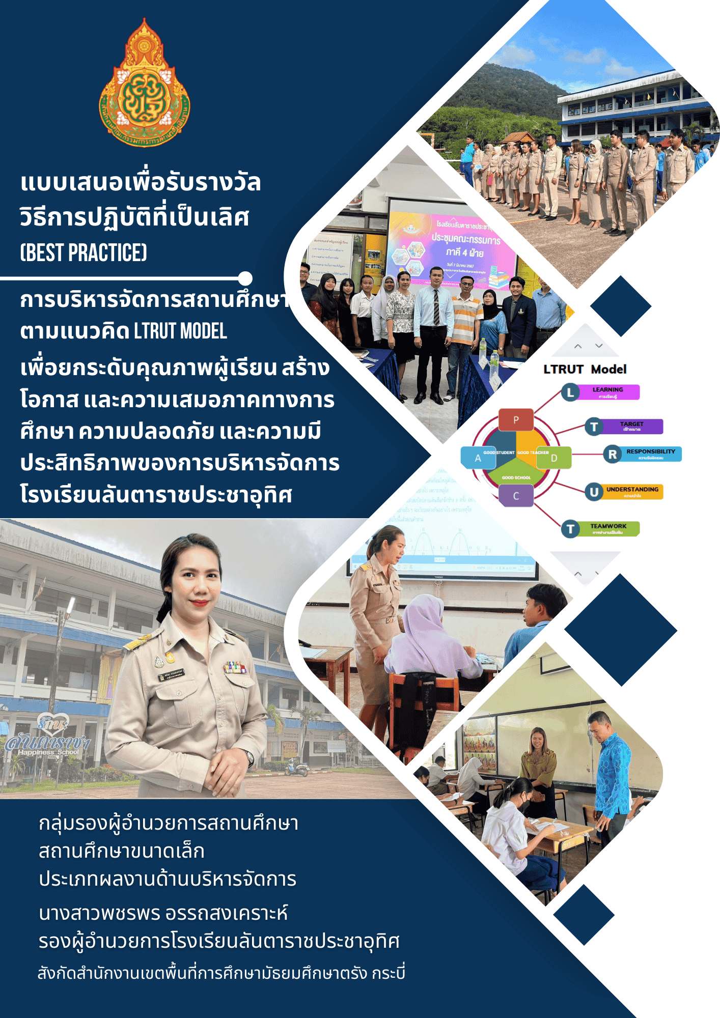 ชื่อผลงาน : การบริหารจัดการสถานศึกษาตามแนวคิด LTRUT Model เพื่อยกระดับคุณภาพผู้เรียน สร้างโอกาส และความเสมอภาคทางการศึกษา ความปลอดภัย และความมีประสิทธิภาพของการบริหารจัดการโรงเรียนลันตาราชประชาอุทิศ